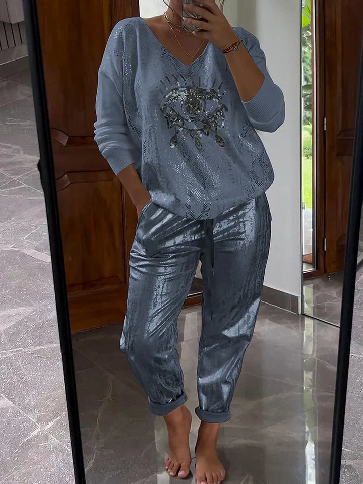 Dette afslappede todelte sæt er designet til at skabe et koordineret look, der skiller sig ud, samtidig med at det bevarer en enkel og ubesværet stil. Den løstsiddende top og de tapered bukser danner en afbalanceret silhuet, der føles udtryksfuld, let at have på og naturligt stilfuld til hverdagens øjeblikke.